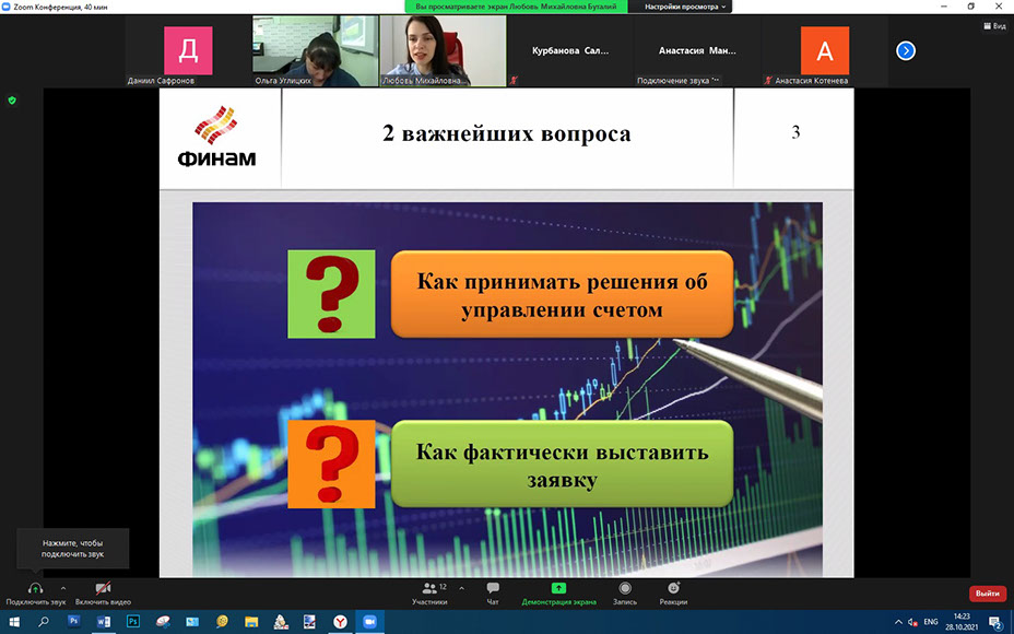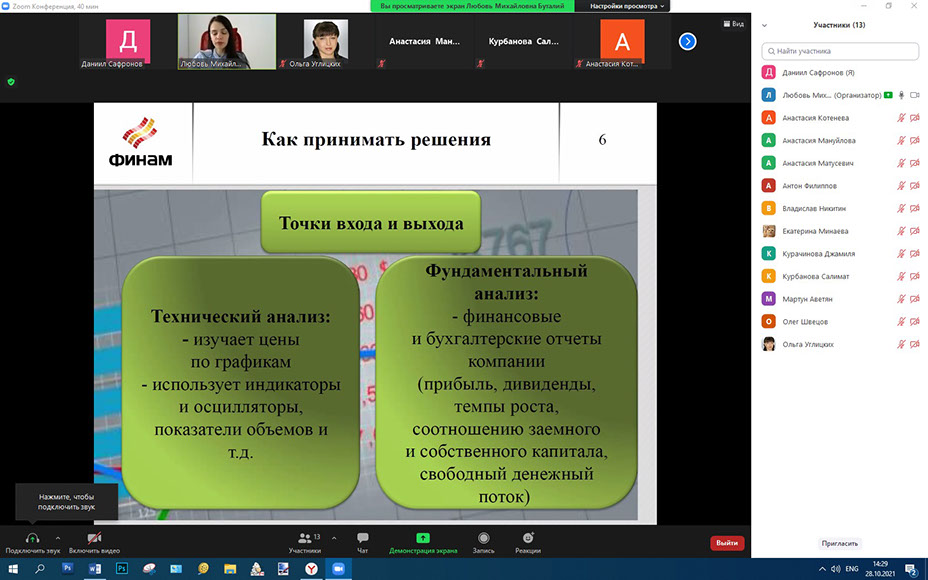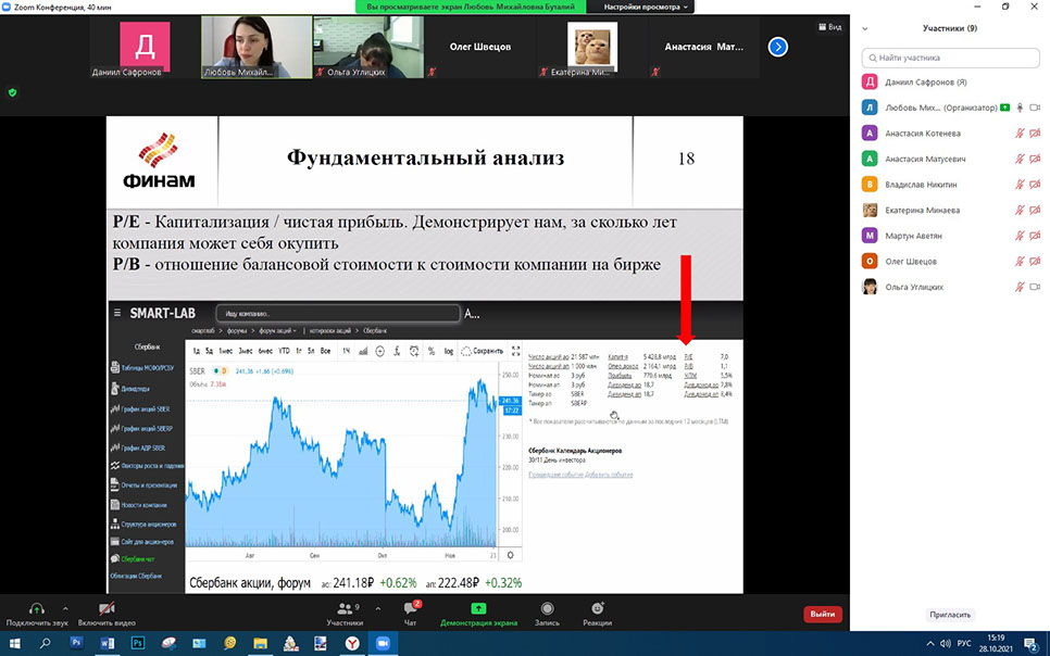 28 октября 2021 года базе Бизнес-школы «Азбука денег» молодежного технопарка «SmartAgro» проведен мастер-класс «Технический и фундаментальный анализ на фондовом рынке» для студентов направления подготовки 38.03.01 Экономика профиль финансы и кредит» 3 курса 2 группы учетно-финансового факультета и специальности 38.02.07 «Банковское дело» 2 курса группы 20БД-11-1 и 3 курса группы 19БД-9-1 факультета среднего профессионального образования в очно-дистанционном формате.