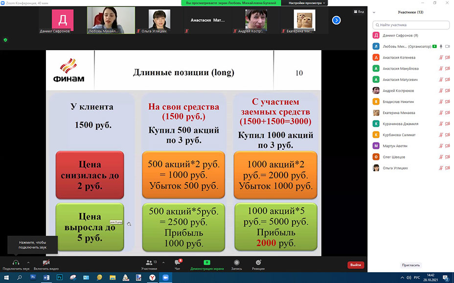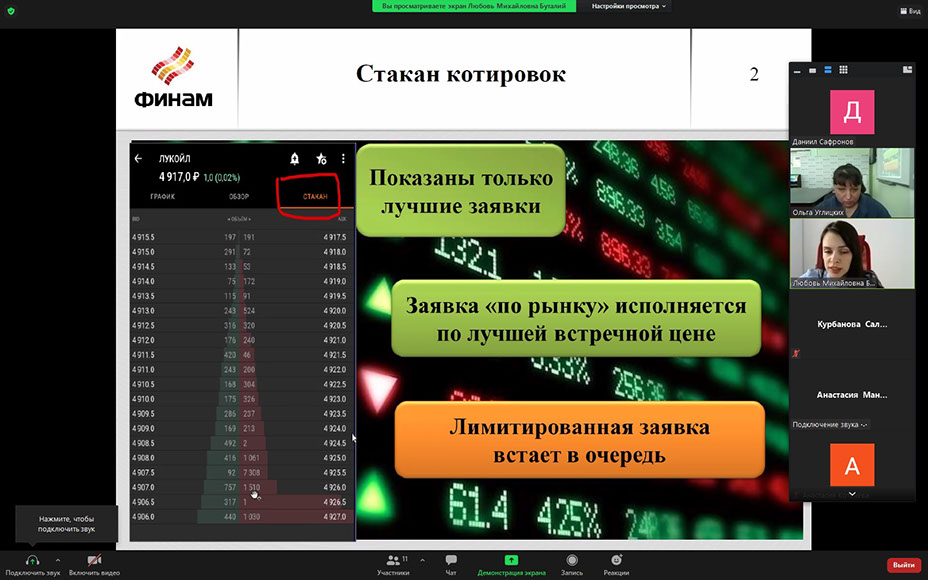 В завершение мероприятия проведена беседа о трендах фондового рынка. Где Любовь Михайловна, пояснила, что одна из самых популярных и эффективных стратегий торговли на бирже строится на следовании тренду. Если цены на актив растут, трейдеры его скупают, чтобы затем продать по возросшей цене (желательно, на пике тренда). Если же цены падают, то трейдеры продают актив, а затем покупают его по низкой цене. Трейдеров, которые рассчитывают на подъем цены и скупают актив для спекуляций, называют «быками», и наоборот, трейдеров, которые прогнозируют падение актива, а потому продают акции, называют «медведями».