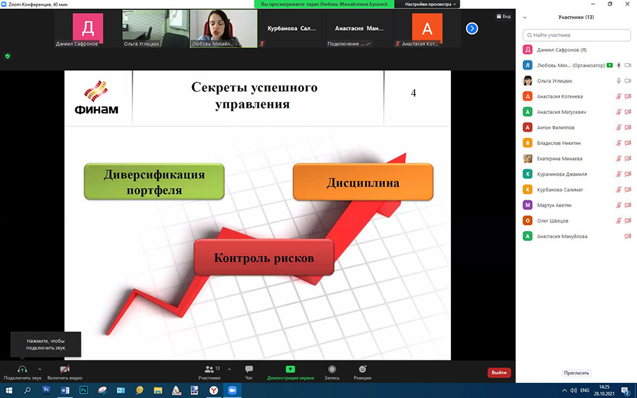 На наглядном примере продемонстрировала, как принимать решение об управлении счетом, и как фактически выставлять заявку на торги, а также раскрыла секреты успешного управления инвестиционным портфелем, которые применяются в настоящее время.