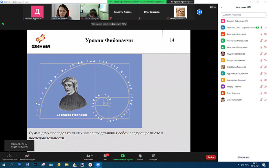 В начале мастер-класса, Любовь Михайловна рассказала участникам, об истории возникновения технического анализа, которая насчитывает более 200 лет, она отметила, что некоторые положения технического анализа разрабатывались Жозефом де ла Вега в 17 веке, для торговли на голландских рынках, а в 18 веке Хомма Мунэхиса, японский торговец рисом, разработал то, что впоследствии стало современными японскими свечами. Последовательность Фибоначчи была хорошо известна еще в древней Индии, где применялась в стихосложении. Но имя свое она получила благодаря европейскому математику XII века Леонардо Пизанскому, более известному по псевдониму Фибоначчи.