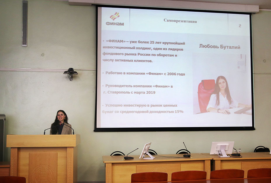 В мероприятии, организованном преподавателями кафедры «Финансы, кредит и страховое дело», приняла участие директор ООО «Финам-Ставрополь» Буталий Любовь Михайловной.
