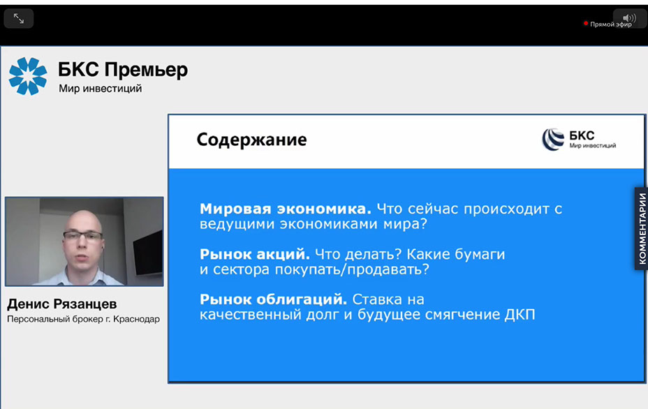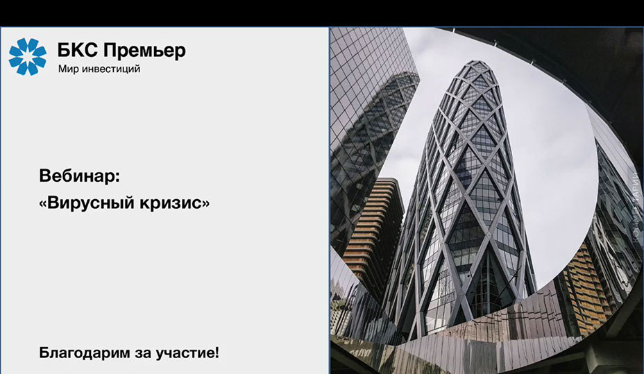 20 мая 2020 года специалисты группы «БКС Премьер» провели вебинар «Вирусный кризис». Спикер мероприятия-персональный брокер - Денис Рязанцев, рассказал о ситуации, сложившейся в мировой экономике, в связи с Пандемией, охарактеризовал сырьевые рынки, сделал акцент на вложениях в рынок акций и облигаций, рекомендовал какие ценные бумаги приобретать или продавать, и как сформировать классический портфель ценных бумаг.